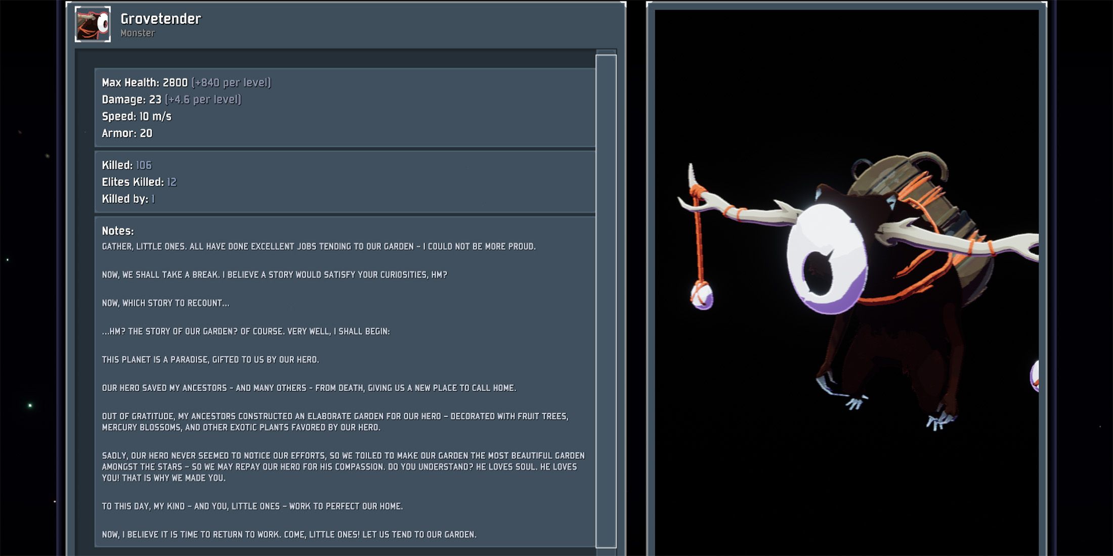 Босс обладает всего двумя формами атаки. Один из них вызывает рой из 18 сияющих фиолетовых самонаводящихся снарядов, которые преследуют игрока и взрываются при контакте. Кроме того, он может запускать многочисленные цепи, нацеленные на игрока, которые приближают его к боссу. Хотя с этими атаками справятся игроки с сильными навыками передвижения, те, у кого ограниченная мобильность, могут счесть Grovetender сложным противником, которого нужно победить.