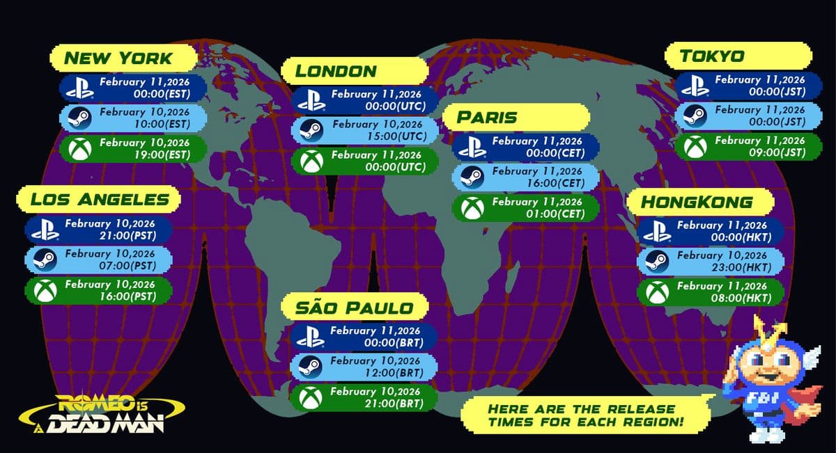 Отличные новости для игроков на консолях! Romeo Is a Dead Man все еще планируется к выходу 11 февраля 2026 года, и Grasshopper Manufacture только что опубликовала карту, показывающую, когда игра будет доступна в разных частях мира. Я так рад наконец-то получить ее в свои руки!