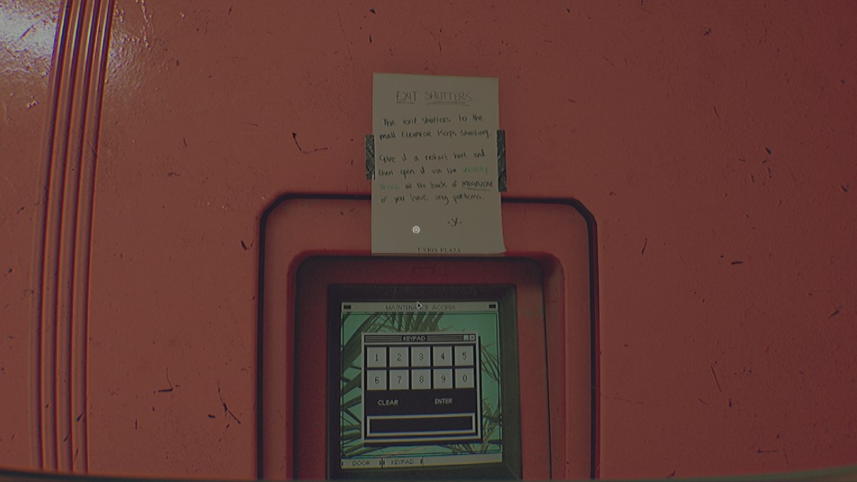Окей, я выяснил, как получить код для двери доступа к техническому обслуживанию выходного затвора! Вам нужно использовать модуль Ultraview, и код — 1842. Наконец-то я смогу туда попасть!