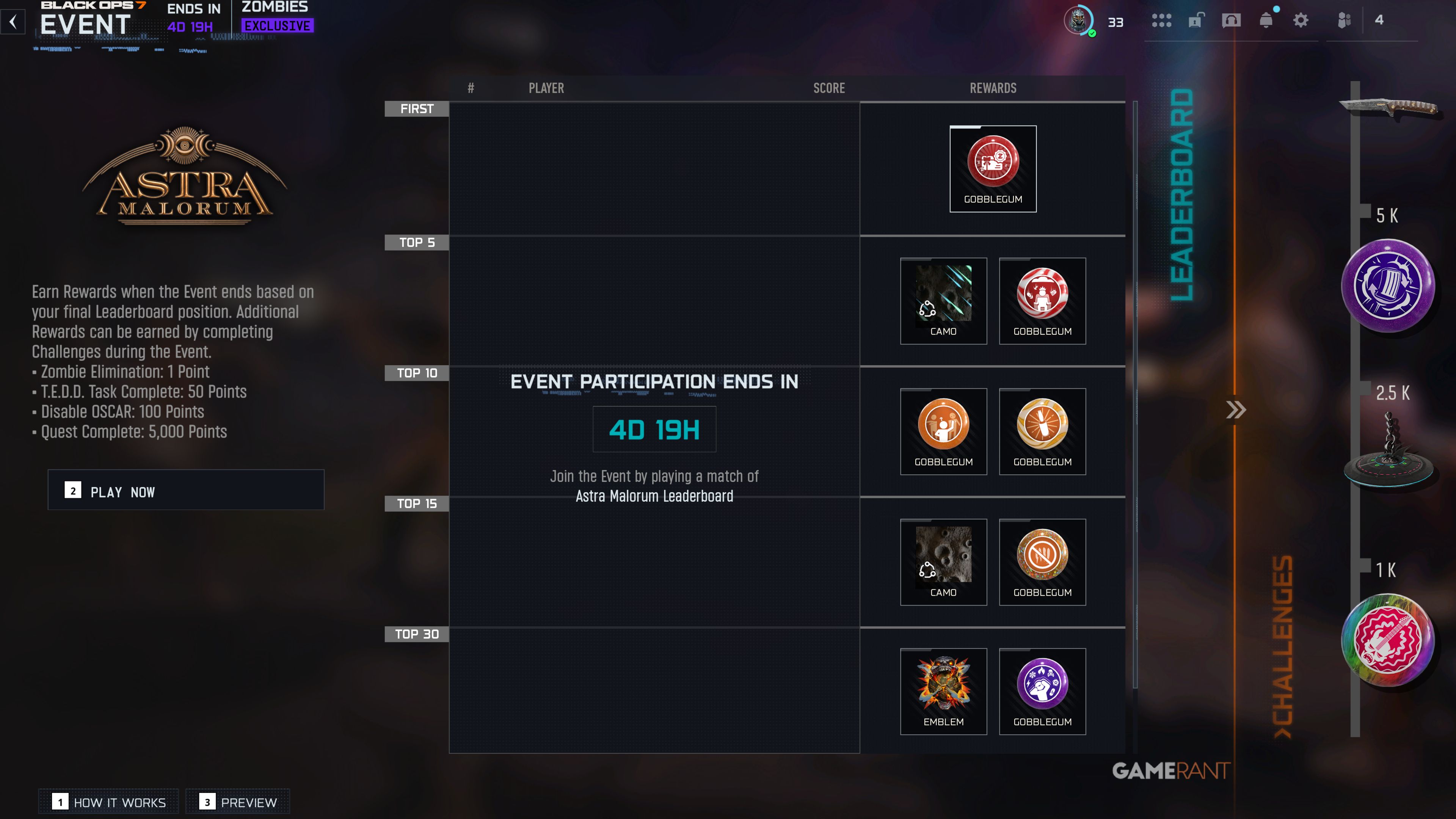 | Explosive Flourish GobbleGum | Заработайте 5 000 очков в событии лидерборда Astra Malorum. |