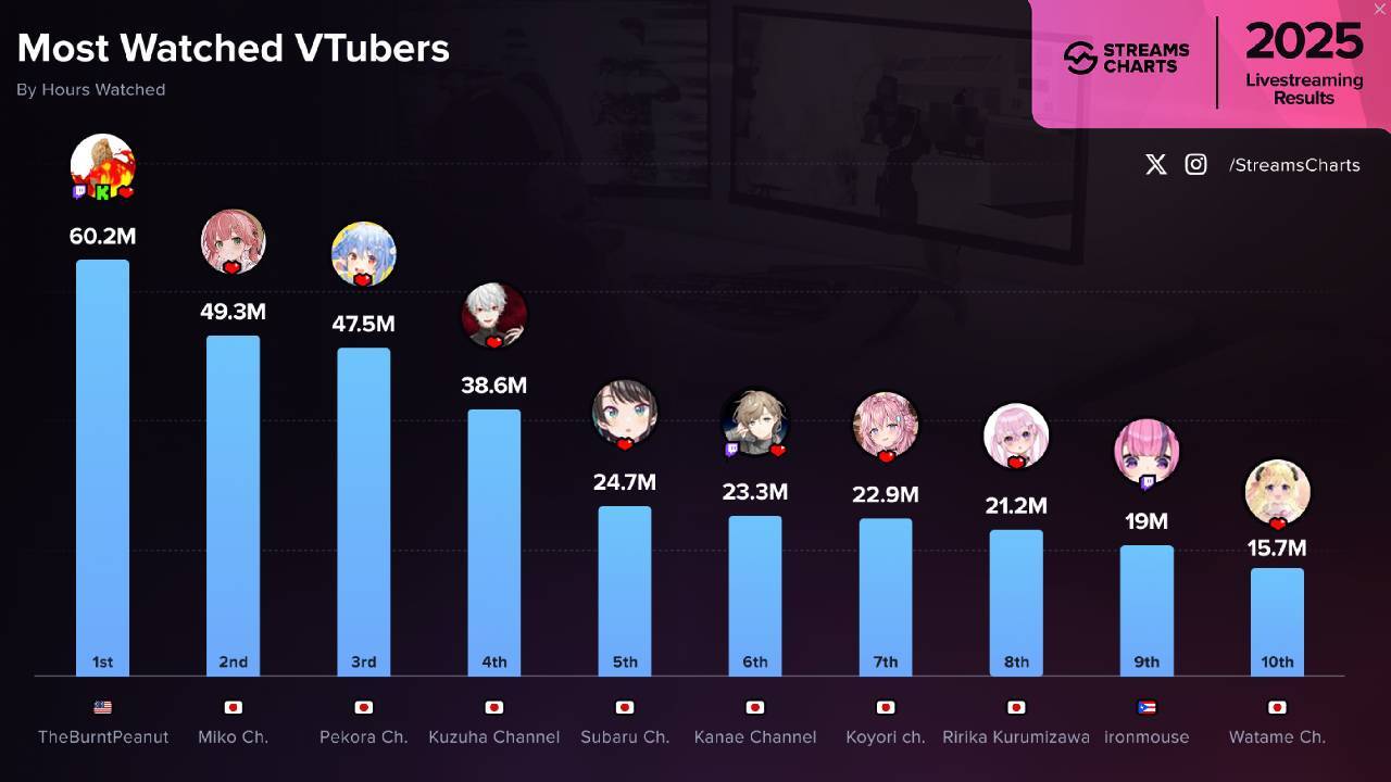 StreamCharts сообщает, что стример набрал впечатляющие 60,2 миллиона часов просмотра в 2025 году. Это значительный отрыв – на 10,9 миллиона часов больше, чем у второго по популярности стримера, Sakura Miko. Он также значительно опережает других популярных VTubers, таких как Ironmouse и Usada Pekora.