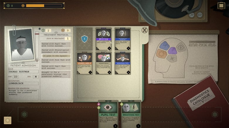 Игра следует простому паттерну. Каждый день вы используете свои заработки, чтобы покупать инструменты и методы лечения – это, по сути, коллекционные карты игры. Затем вы принимаете пациентов и пытаетесь понять, что с ними не так, сопоставляя их симптомы с категориями, используя несколько старомодный и сомнительный метод, называемый френологией. Наконец, вы лечите каждого пациента, основываясь на том, что вы диагностировали, и имеющихся у вас методах лечения.