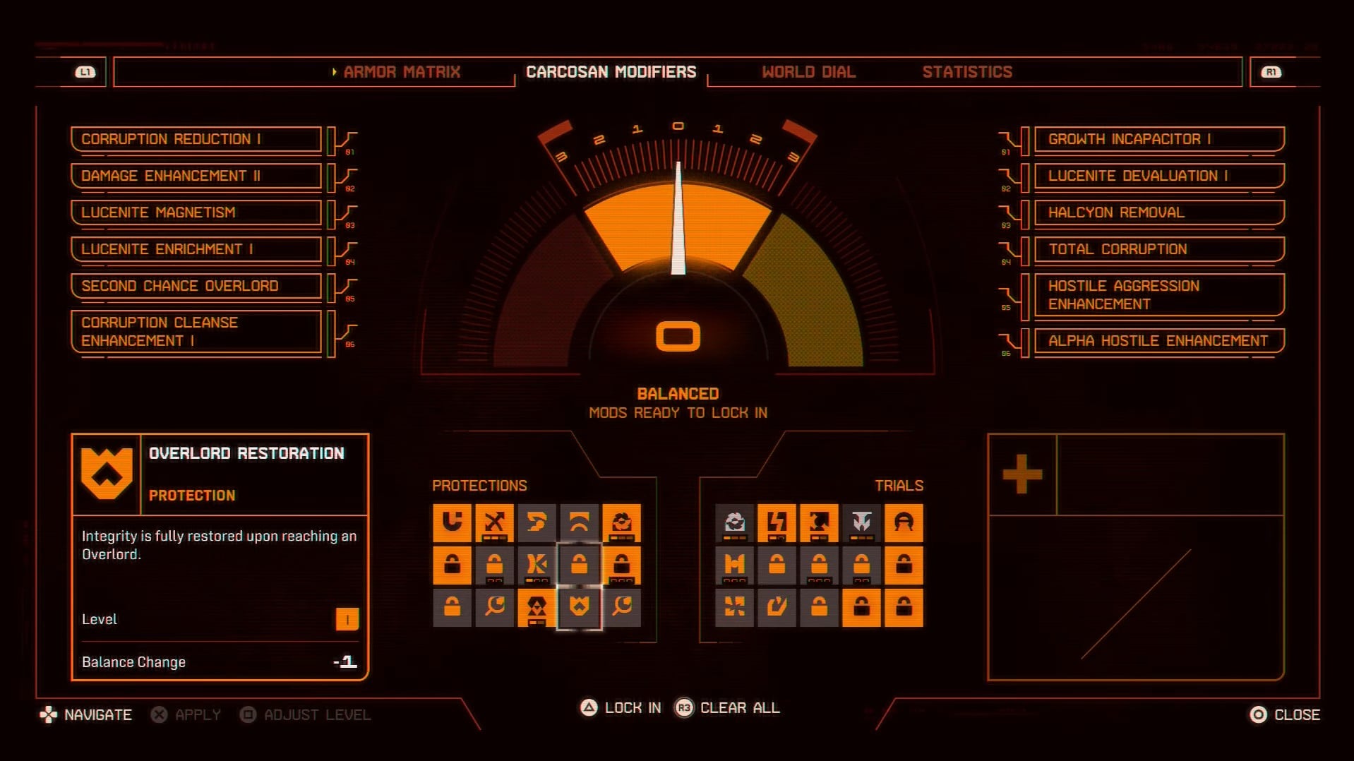Каждый модификатор влияет на баланс игры. Лучше всего использовать эти модификаторы, чтобы удерживать баланс в зоне ‘Balanced’ для комфортного игрового опыта. Если вы ищете более сложный опыт, похожий на игру Returnal, активируйте модификаторы из категории ‘Trials’. Это сместит баланс в сторону ‘Overloaded’ и сделает игру намного сложнее.