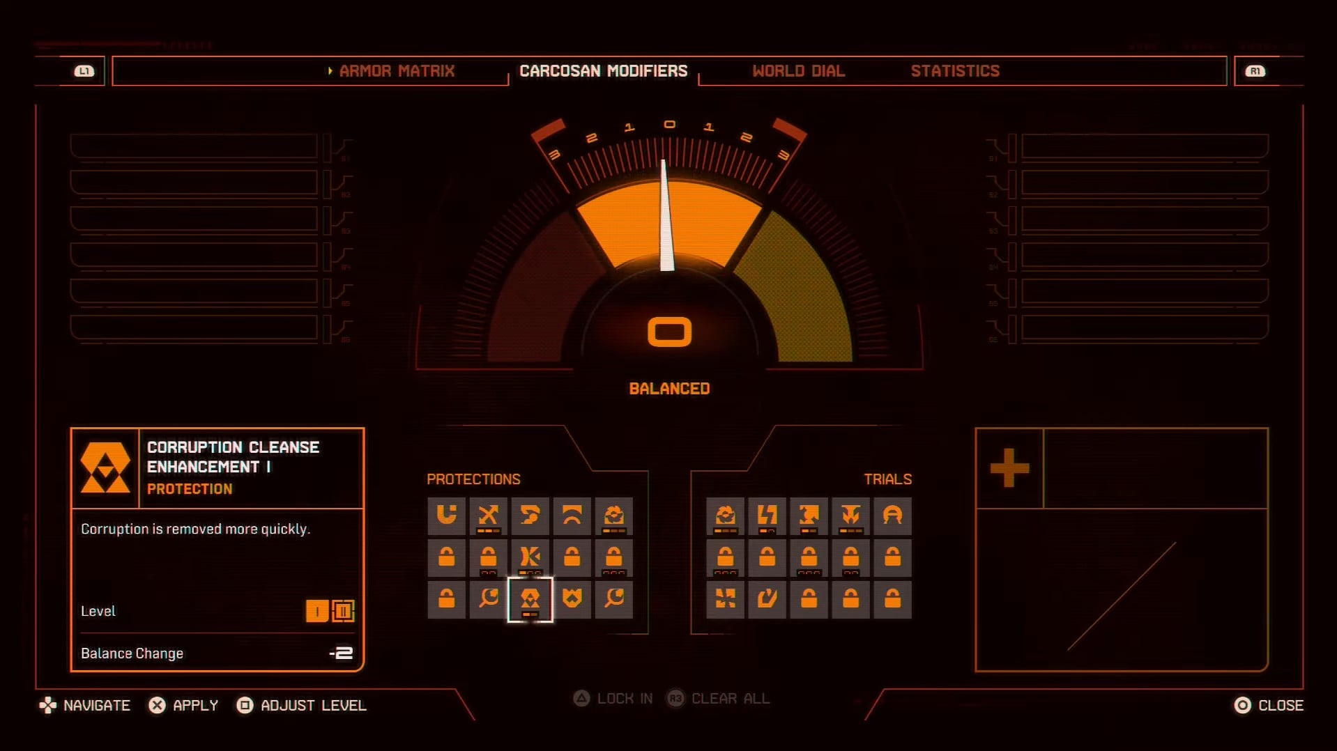 Вы можете использовать до 12 модификаторов в общей сложности, с ограничением в 6 от каждого типа: Защиты и Испытания. Вы начнете с небольшого количества доступных модификаторов, но сможете открыть больше по мере игры. После прохождения основной сюжетной линии хотя бы один раз, все модификаторы будут открыты. Если вам кажется, что более поздние части игры слишком сложны, модификаторы Каркосана могут помочь. Просто помните о необходимости сбалансировать выбранные вами защиты с выбранными испытаниями.