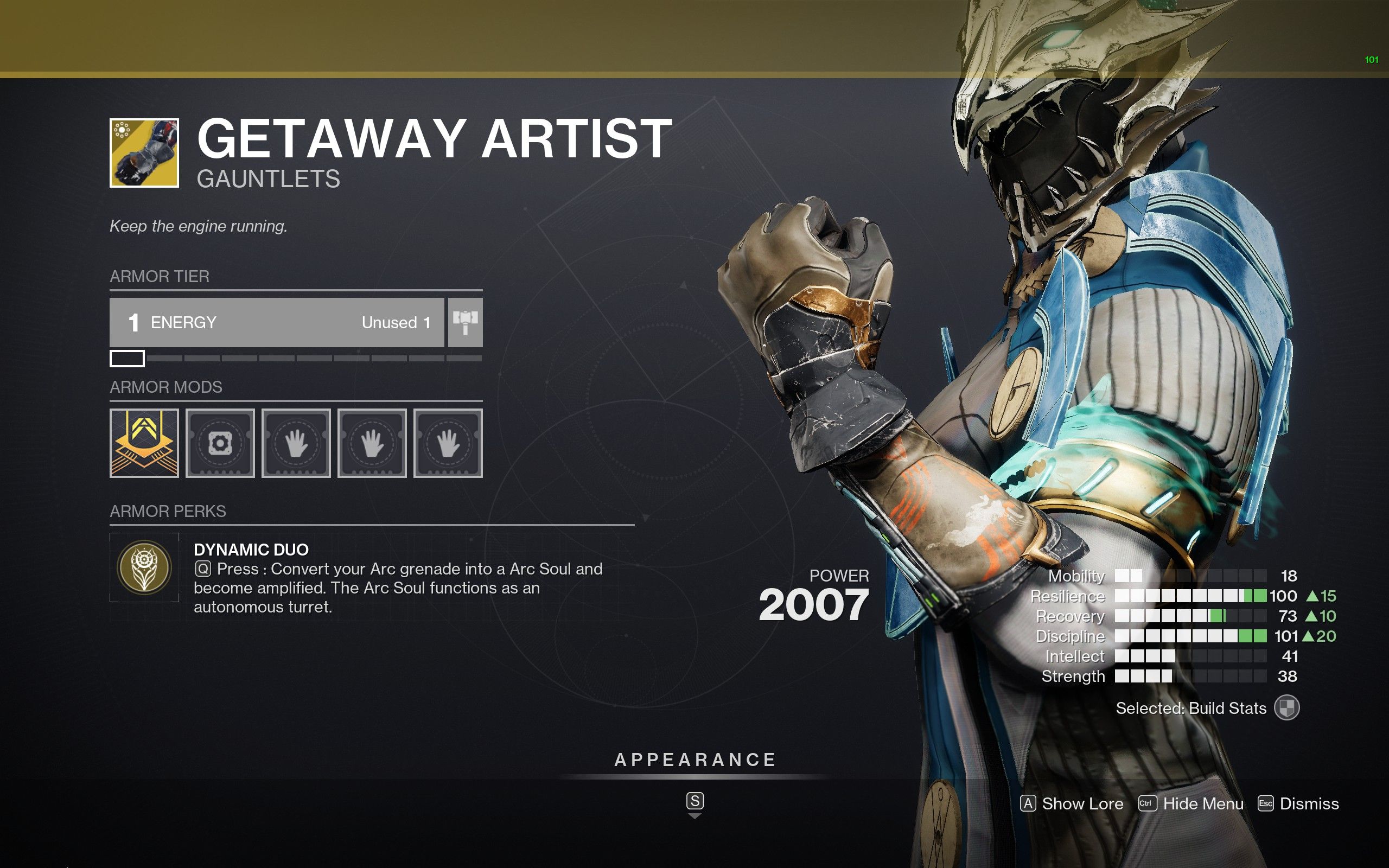 В финальной форме художник из бегства в Destiny 2 был особенно мощным из -за первоначально одолевшего мод артефакта, называемого Galvanic Armor из эпизода 1. Этот мод обеспечил 30% сопротивление на ущерб, когда опекуны с дугами или призматическими подклассами имели усиленный бафф. Приобретение этого баффа был относительно простым благодаря аспекту цели и других методов, но гальваническая броня была доступна только временно. Однако изменения, внесенные в дуговые глаголы и подклассы в ересь, с тех пор повысили эффективность усиленного баффа, теперь обеспечивая: