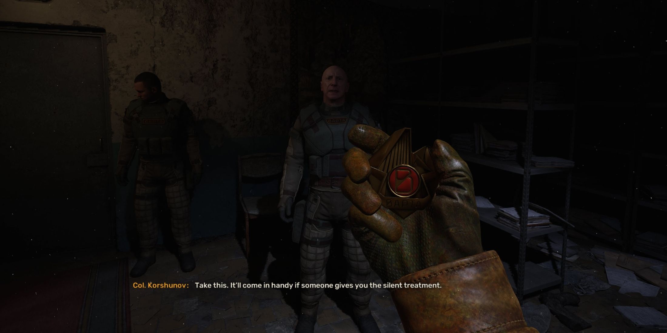 - Получите «Значок охраны» от Коршунова, который значительно облегчит вход в запретные зоны и на базы.