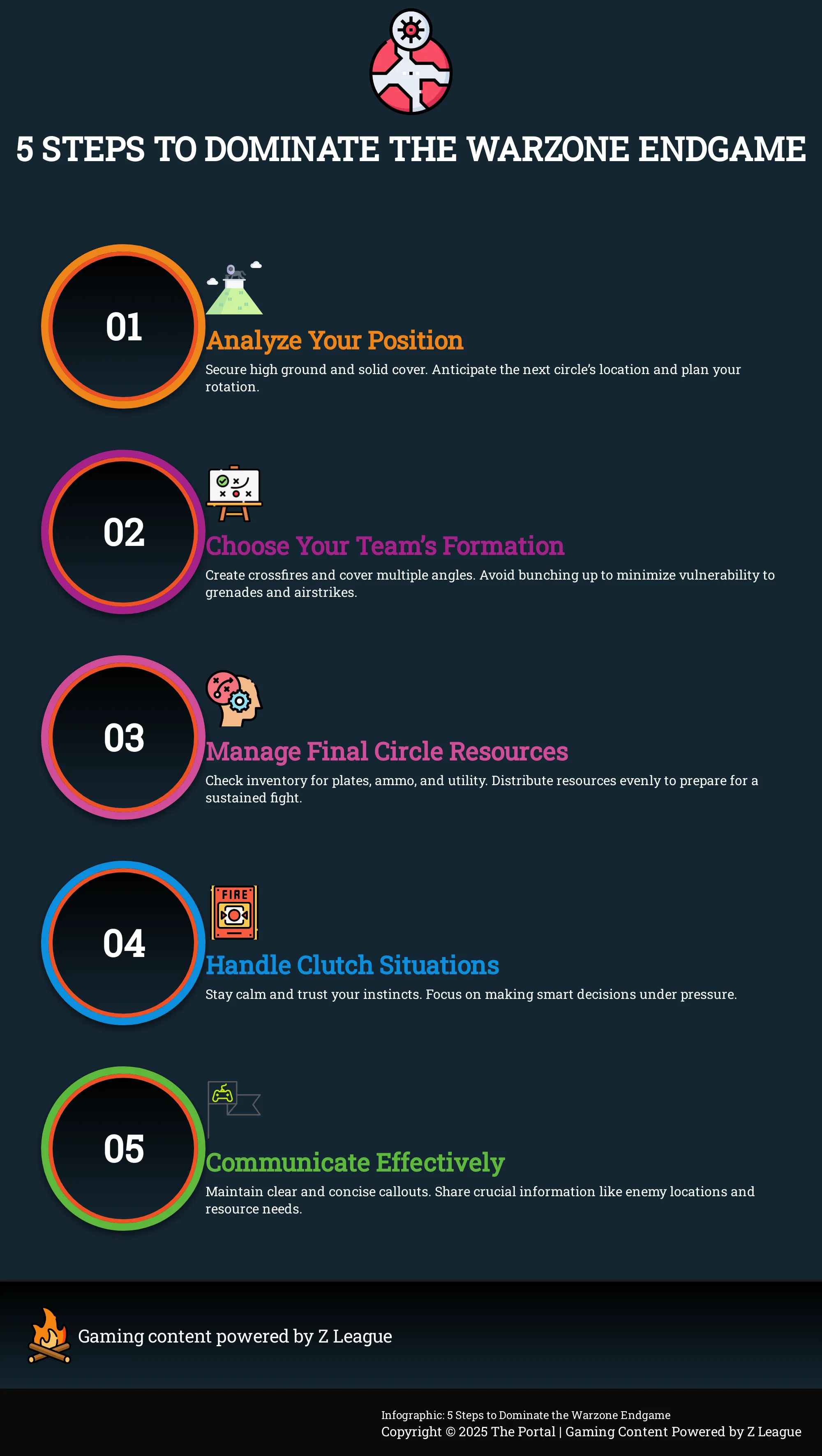 Другими словами, в критические моменты важно сохранять хладнокровие, имея чёткий и понятный план действий. Когда зона сужается, ваша команда должна сосредоточиться на трёх основных аспектах: расположении, ресурсах и коммуникации. Начните с поиска самого безопасного стратегического местоположения для вашей команды, сделайте его приоритетным и придерживайтесь этого места. Во-вторых, оцените имеющееся у вас оборудование и припасы, поделитесь этой информацией со всеми, чтобы убедиться, что каждый готов. И последнее, сообщите о своей стратегии для финальной схватки. Наличие плана помогает уменьшить панику, поскольку все понимают, что следуют стратегии, а не реагируют наугад. Помните, что нужно глубоко дышать; несколько моментов спокойствия могут значительно улучшить вашу производительность.