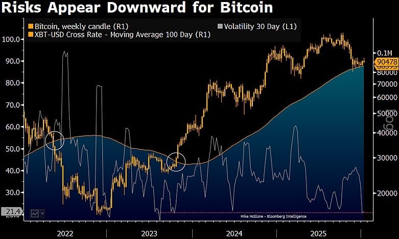 Майк МакГлоун, этот закаленный мудрец из Bloomberg Intelligence, вышел на X 10 января, чтобы нарисовать картину шаткого положения Bitcoin. Он говорит не только о цифрах — он диагностирует лихорадочный рынок, затаивший дыхание, балансирующий на краю обрыва с надписью «2026». Волатильность? Подавлена, как костёр под дождём. А риск? Растёт, как сорняки в засуху.