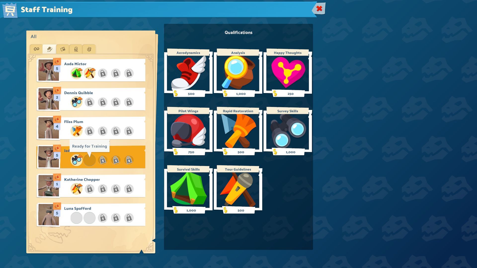 На начальных этапах управления вашим первым музеем вы сможете обучать членов вашей команды в специализированных областях, относящихся к их должностям в организации. Это обучение предоставит им уникальную профилимость, которая может помочь им решить дополнительные обязанности по всему музею и за его пределами. Навыки, которые они могут приобрести, включают навыки выживания для экспертов, что позволяет им приступить к опасным экспедициям или навыки семинара для уборщиков, что позволяет им создать интерактивный опыт, подходящий для молодых посетителей.
