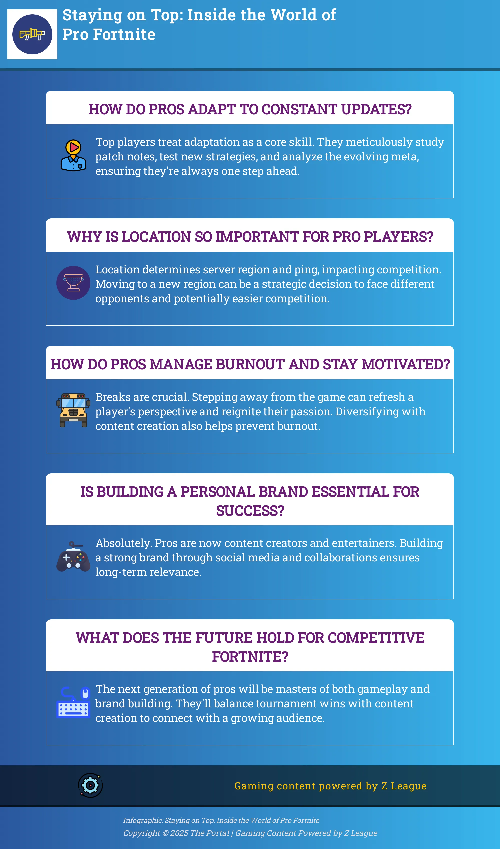 В Fortnite соревновательный ландшафт постоянно меняется благодаря частым обновлениям игры и адаптации опытных игроков к ним. Заглядывая в будущее, необходимо понимать, что требуется для того, чтобы стать топ-профессионалом, и какие тактики они применяют. Это слияние интенсивной конкуренции с тщательным развитием карьеры. Мир профессиональных соревнований по Fortnite не только о наборе убийств; это создание устойчивого присутствия внутри и за пределами игры. Эта эволюция побуждает игроков думать как предпринимателей, совмещая подготовку к турнирам с созданием контента для привлечения обширной и быстро растущей фанбазы.
