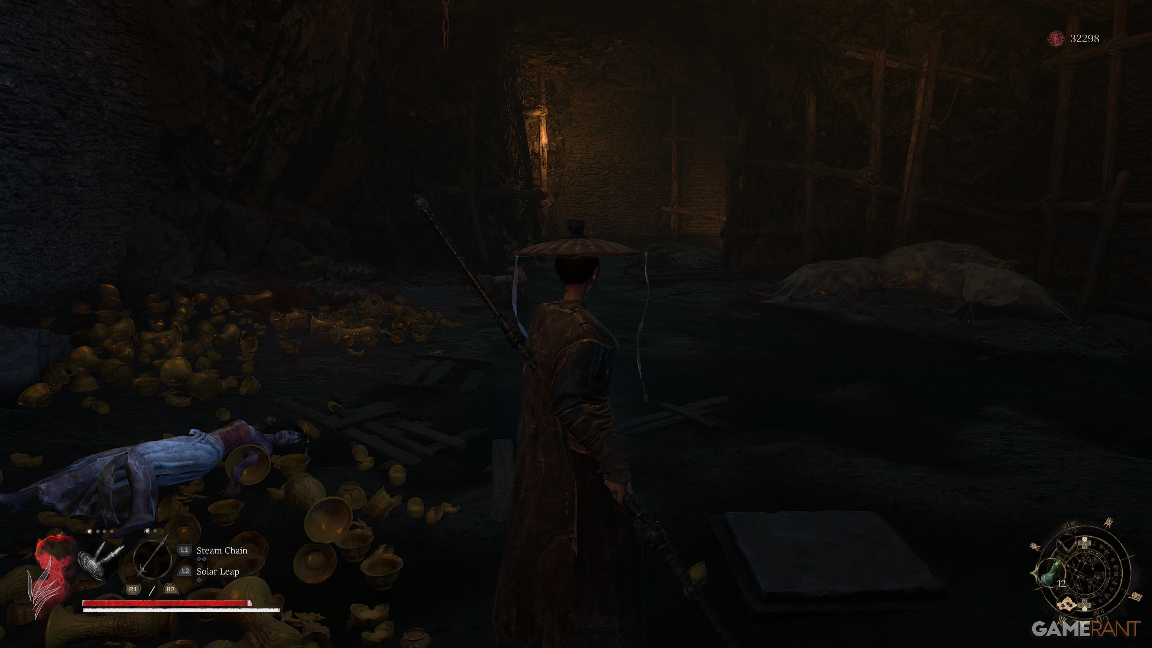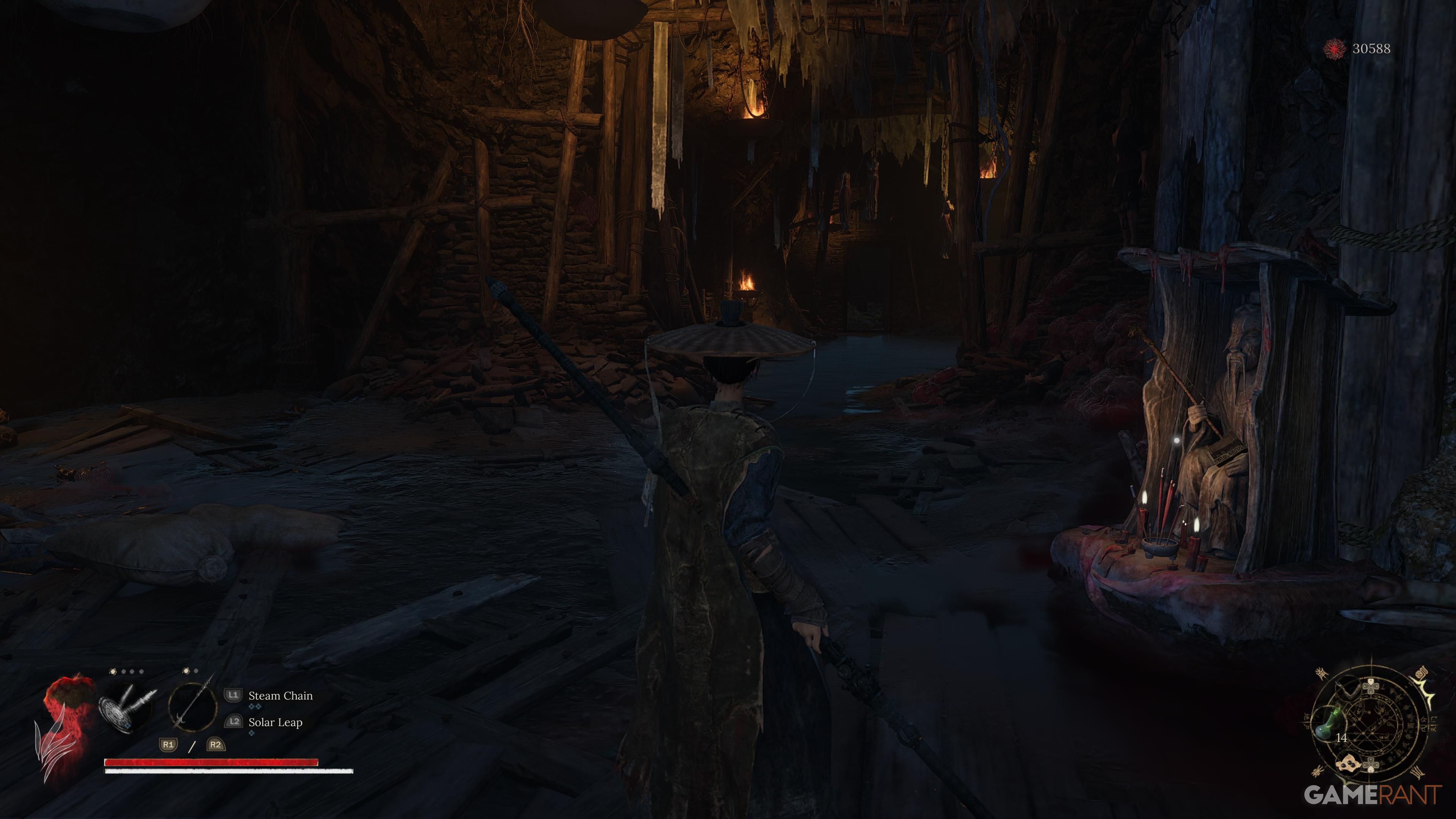После второго валуна продолжайте двигаться вперед по тропе, затем спуститесь в углубление, чтобы обнаружить сундук с сокровищами. Внутри находится улучшение для Манны Вазе и дверь, которую можно открыть. Выйдите через дверной проем и будьте осторожны при обходе ловушек до достижения второй святыни в этом регионе.