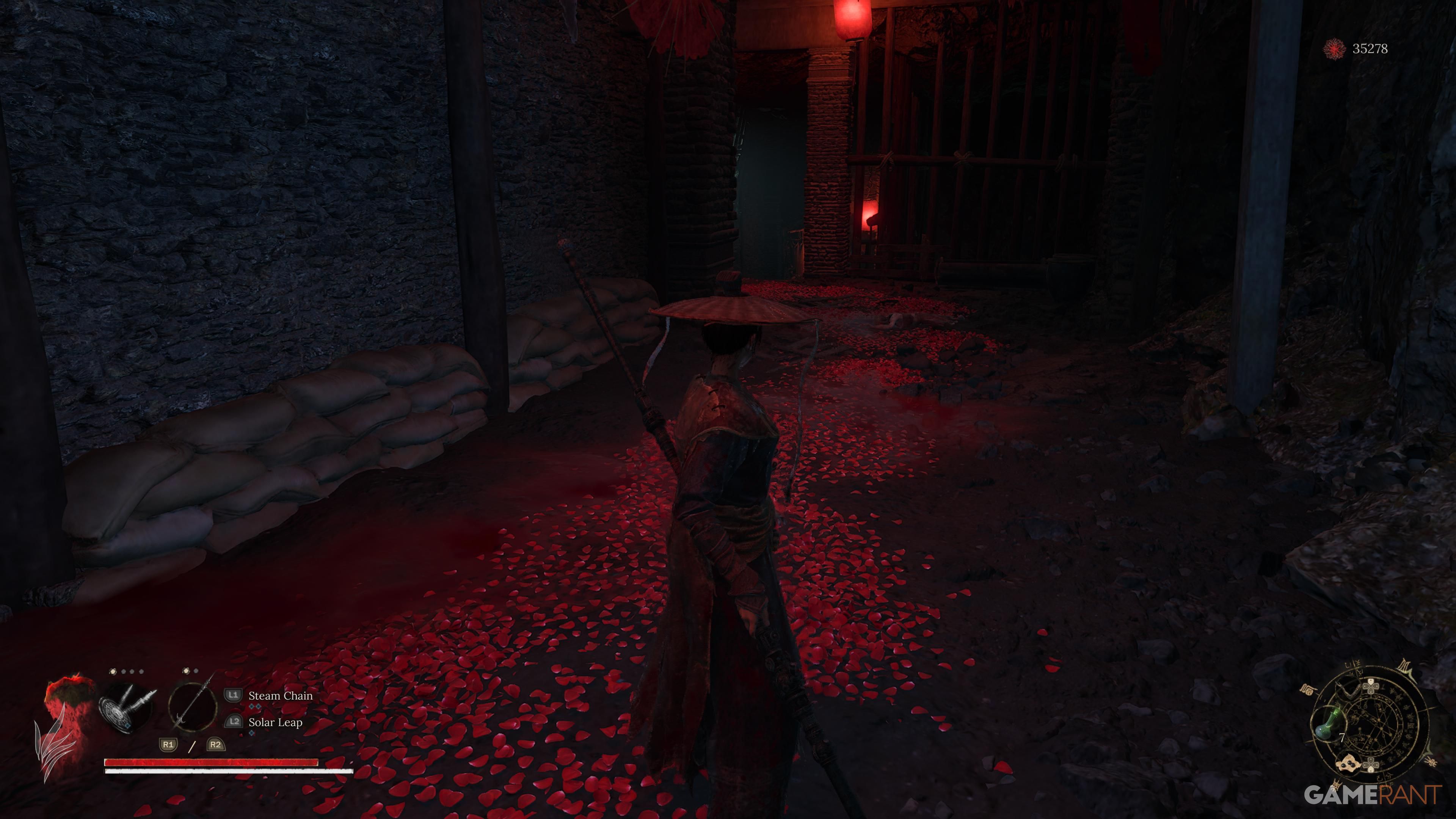 От святилища поверните налево и пройдите через деревянный вход. Затем сверните направо вверх по тропинке до первого дома слева от вас, войдите в него и поднимитесь по лестнице. Обратите внимание на сложный механизм впереди, который следует обойти. Продолжайте движение вправо до развилки пути, там следуйте левой тропой к лагерю повстанцев. Задействуйте врагов с пушками и ищите маленькую лестницу впереди. Лестница приведет вас внутрь святилища лагеря повстанцев.