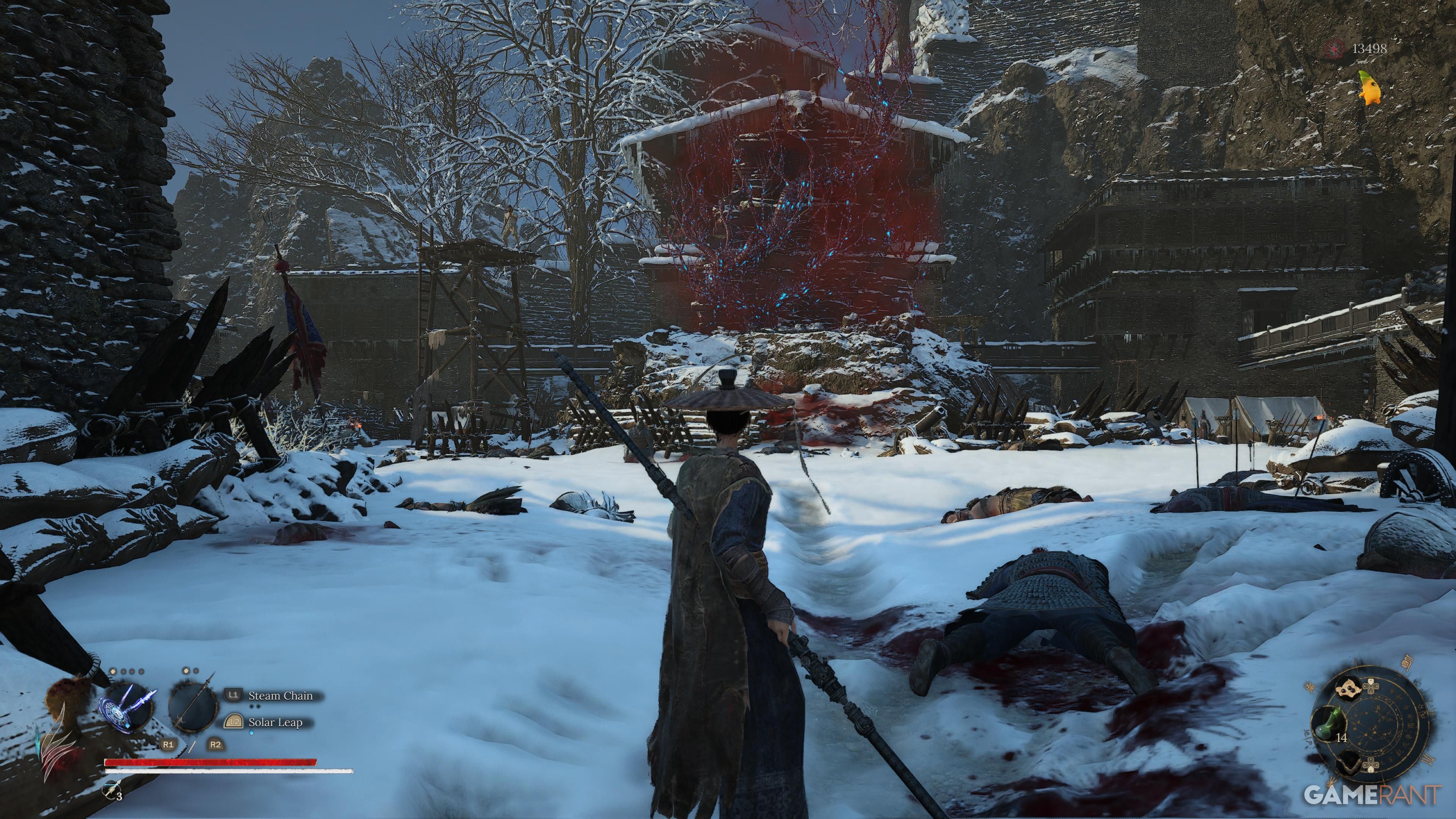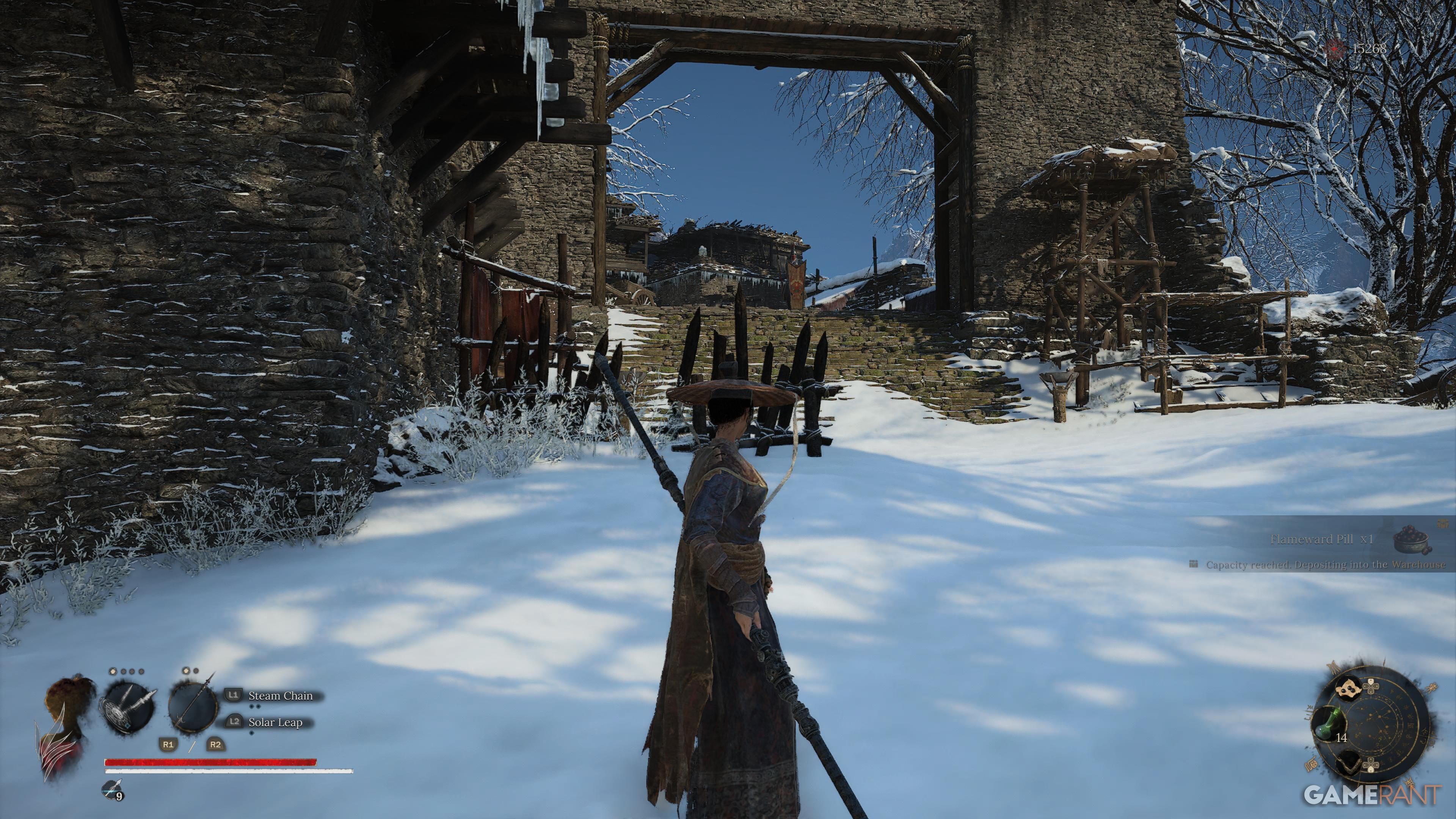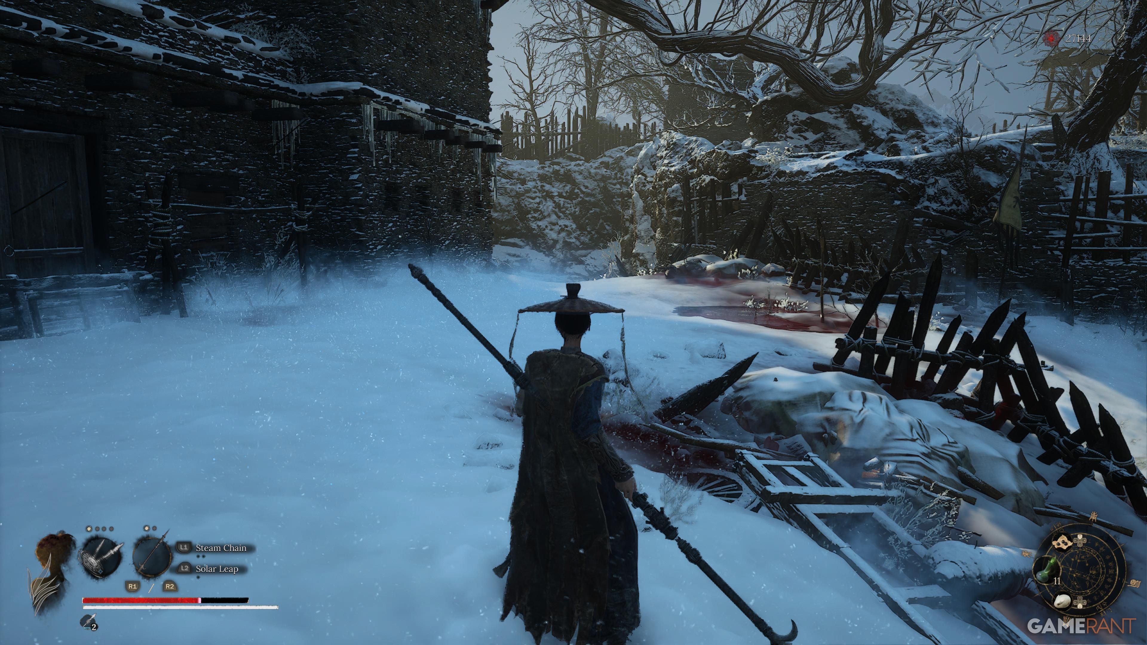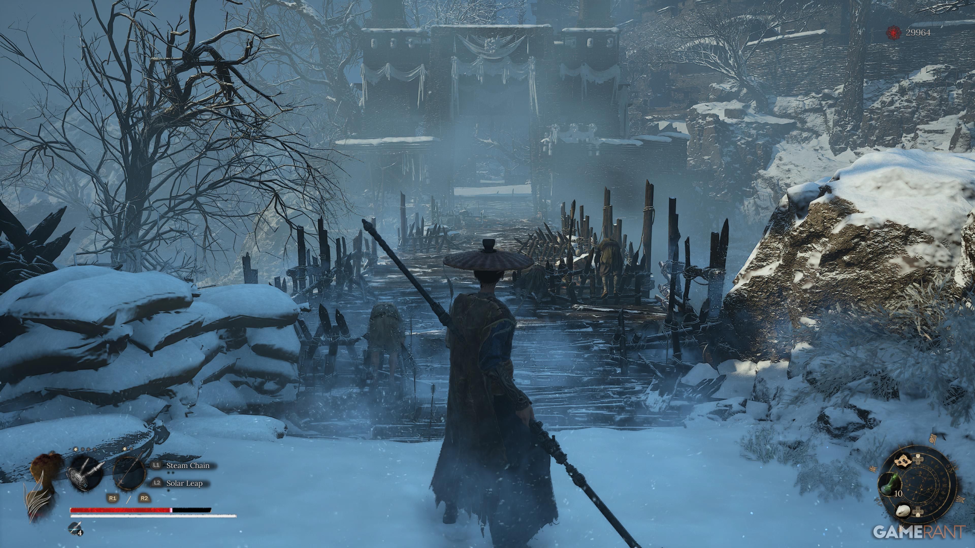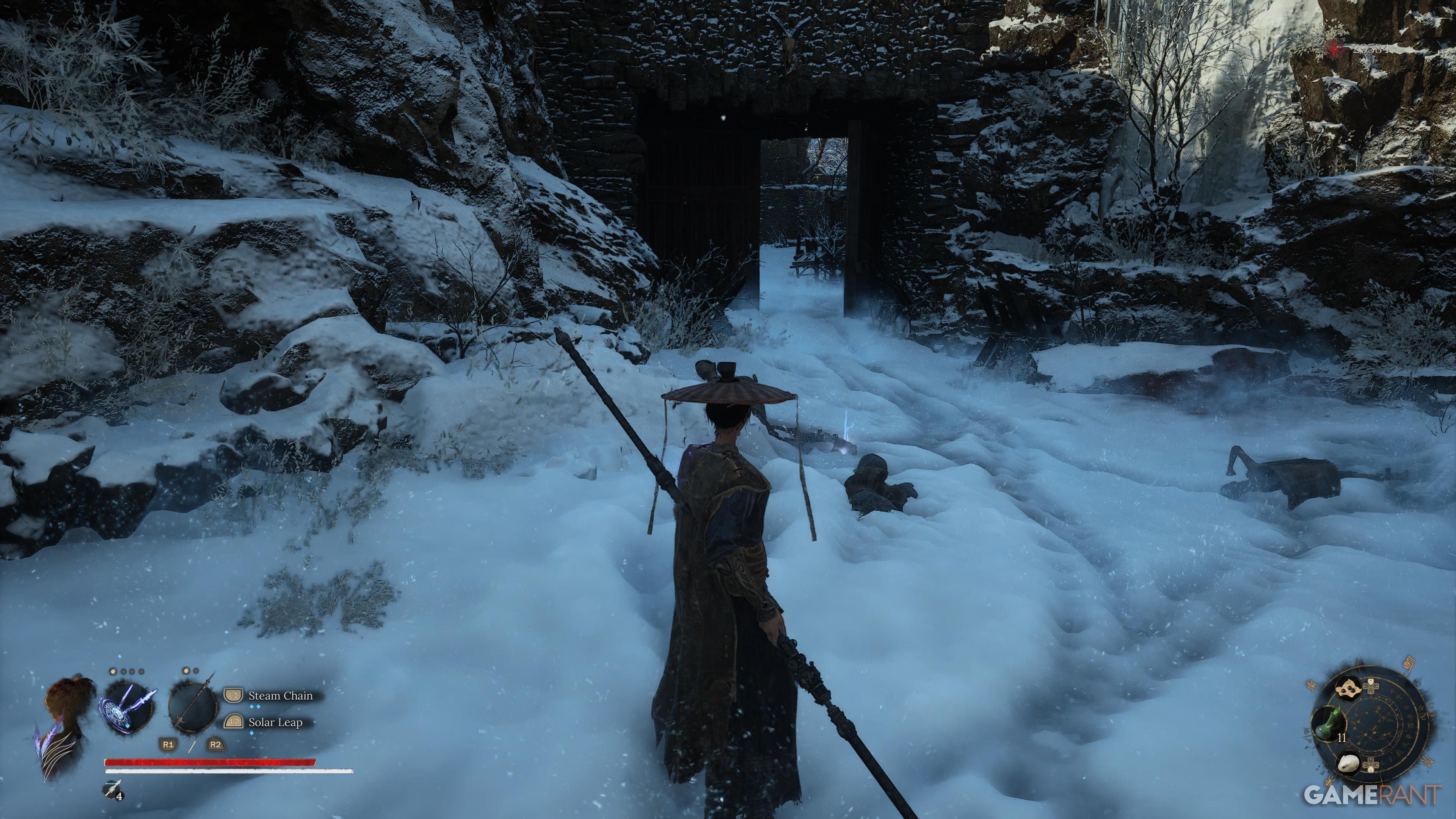 Пока вы идёте немного вперёд, найдёте второй святилище под названием ‘Снежный проход’, который можно активировать и нажать. Продолжайте путь вверх по тропе слева от вас, пройдите через деревянные ворота, чтобы добраться до ‘Окрестностей Туманов’. Сделайте левый поворот, когда заметите двух собак справа от себя. Здесь вы встретите повстанцев, сражающихся с врагами в виде птиц; разберитесь с ними, затем поднимитесь по ступенькам и увидите мины на земле. Справа можно увидеть открытую дверь, ведущую в комнату с большим квадратным устройством, создающим существ в форме птиц. Крайне слева от этой области находится ещё одно святилище, также известное как ‘Окрестности Туманов.’