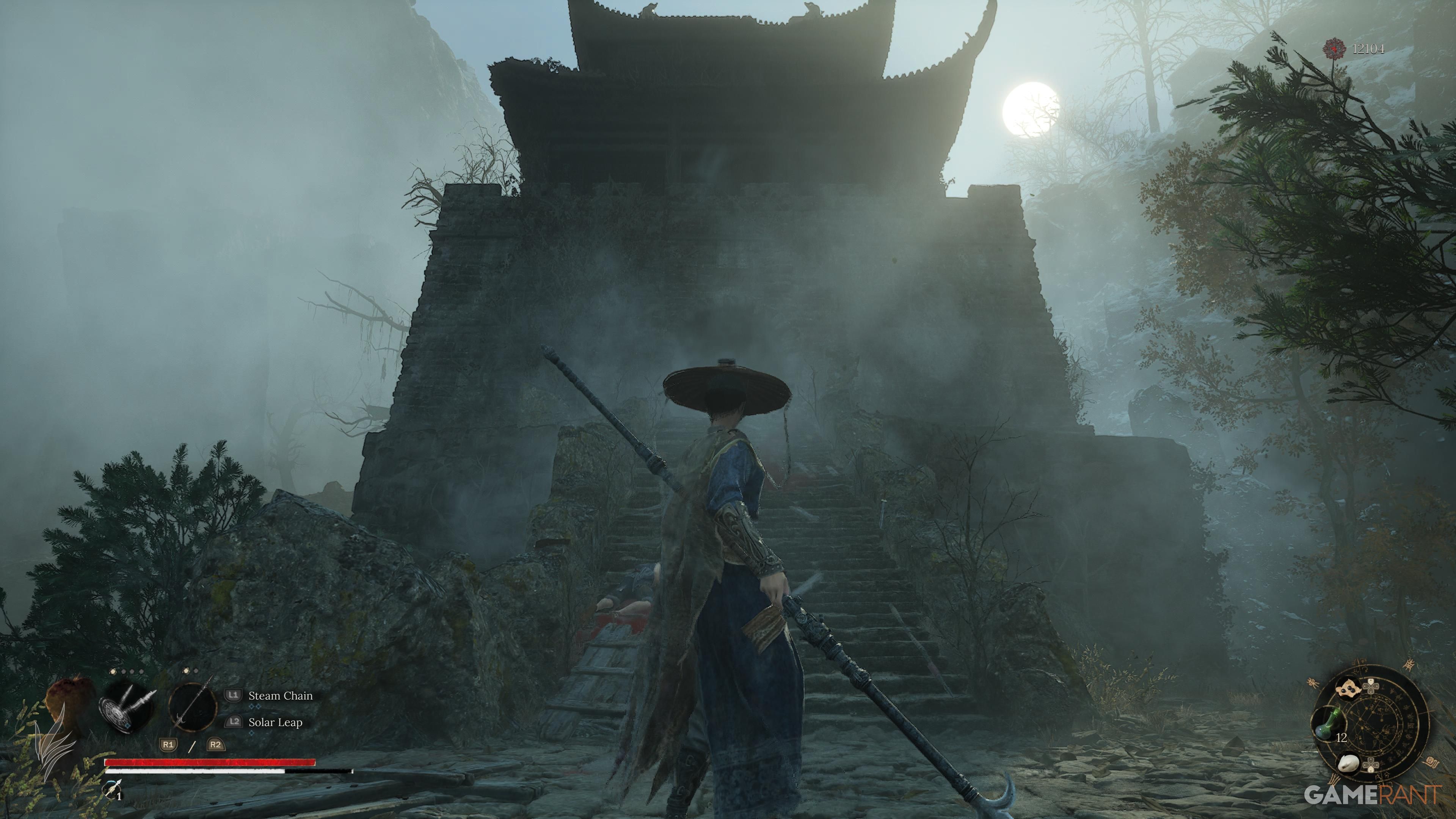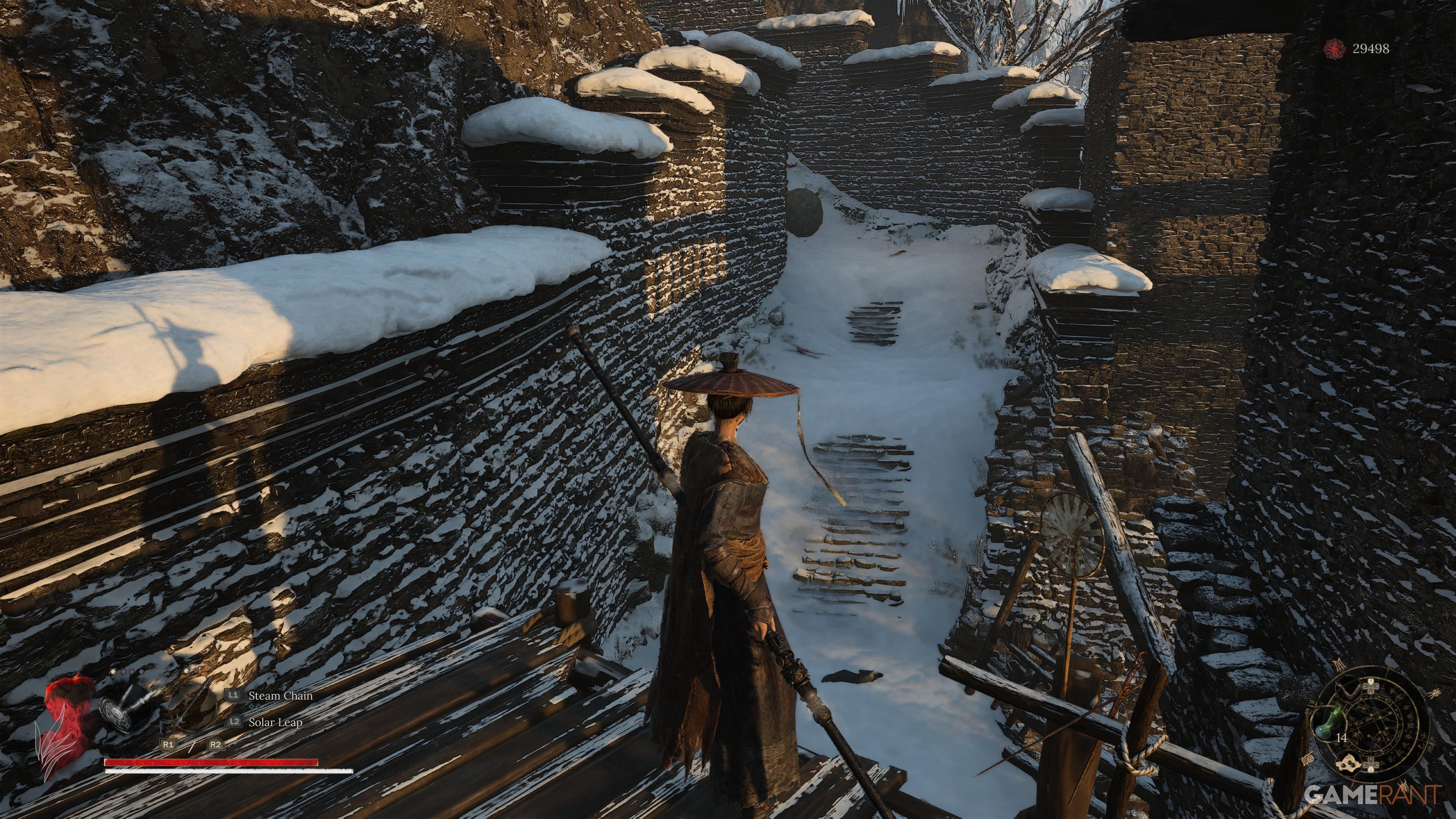 Подходите к двери около святилища и поднимитесь по лестнице за ним. Пройдите внутрь здания, затем спуститесь в какой-то момент; вы заметите след слева от выхода, который приведет вас наружу. Идите вперед, и когда встретите лестницу, смело поднимайтесь вверх.