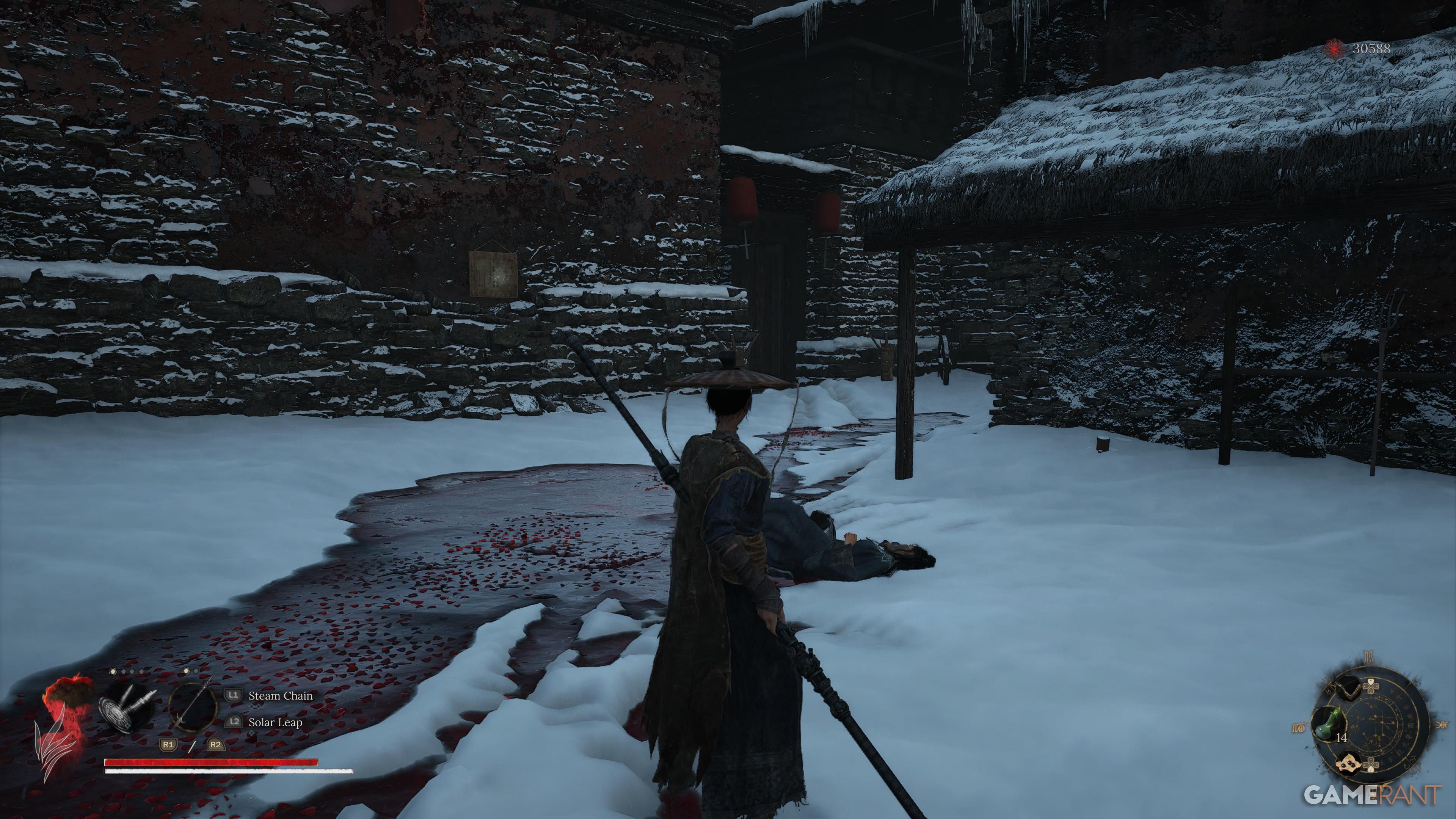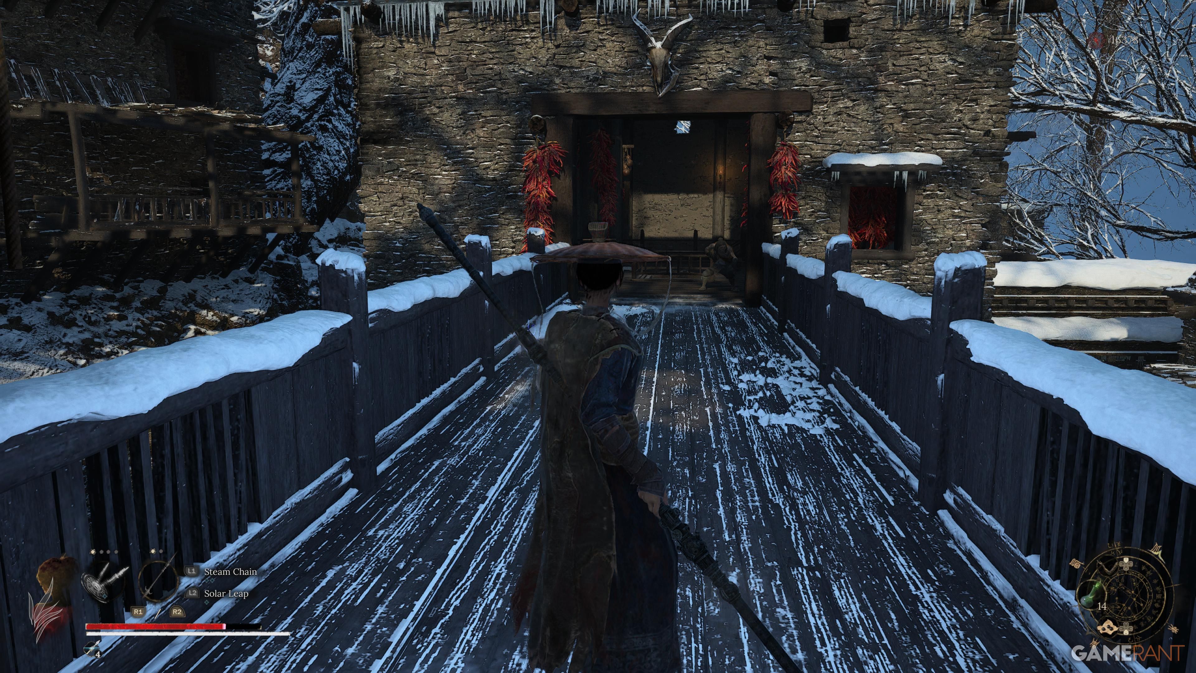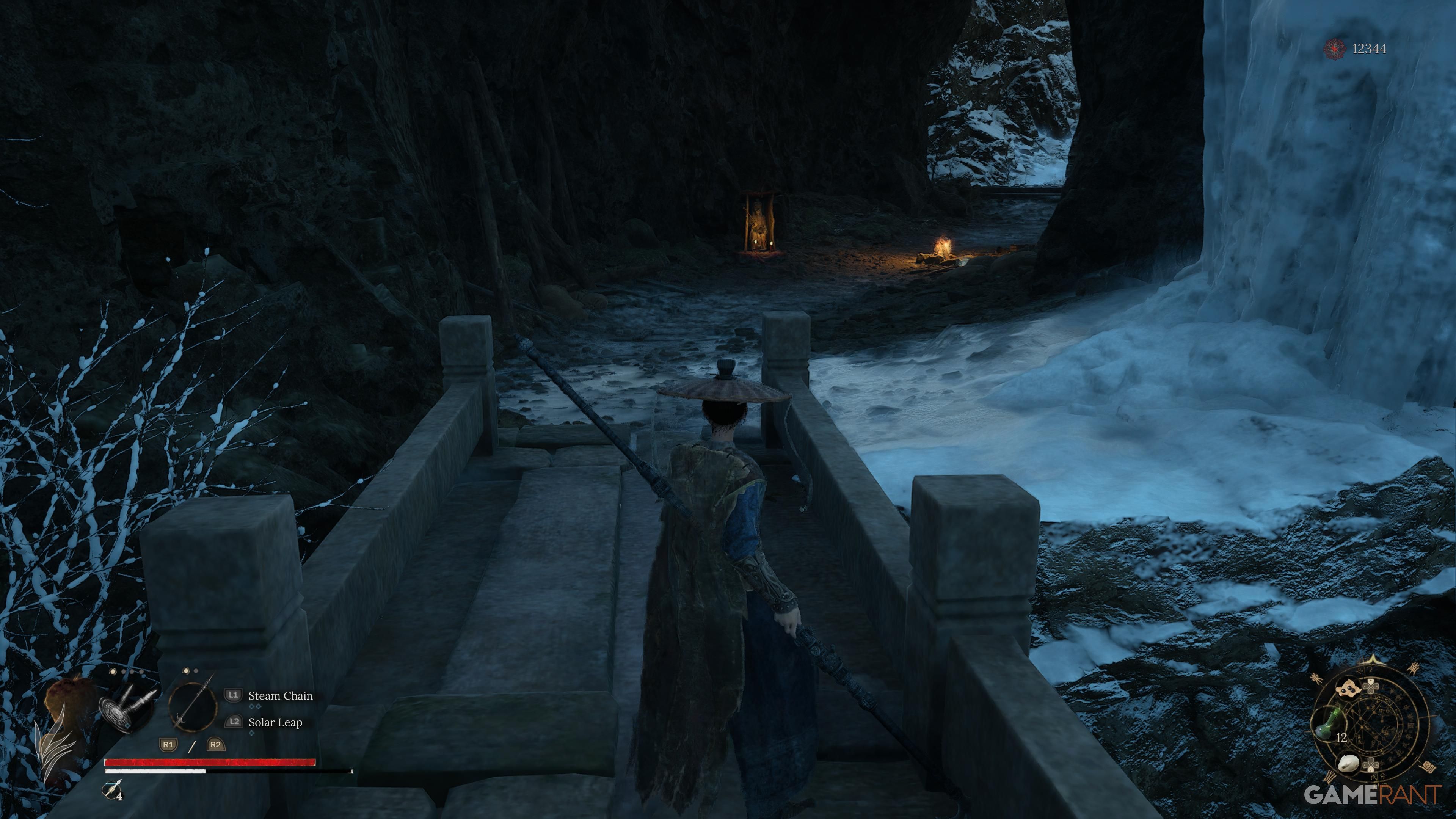 После победы над начальным боссом и просмотра сцены вернитесь по правому пути мимо святилища к развилке, где вы раньше пошли направо в лагерь повстанцев. На этот раз выберите противоположный путь и пройдите через открытый вход. Идите сначала направо, затем налево и сразу же снова направо после пушки. Этот маршрут приведет вас к кратчайшему пути к святыне Cloudspirer Outskirts, что будет полезным, так как это ближайшее святилище к боссу. Продолжайте движение вверх по основной дороге до деревянного моста. В конце этого моста вы найдете арену для боя с генералом Мингом — Лю Ченг’эн.