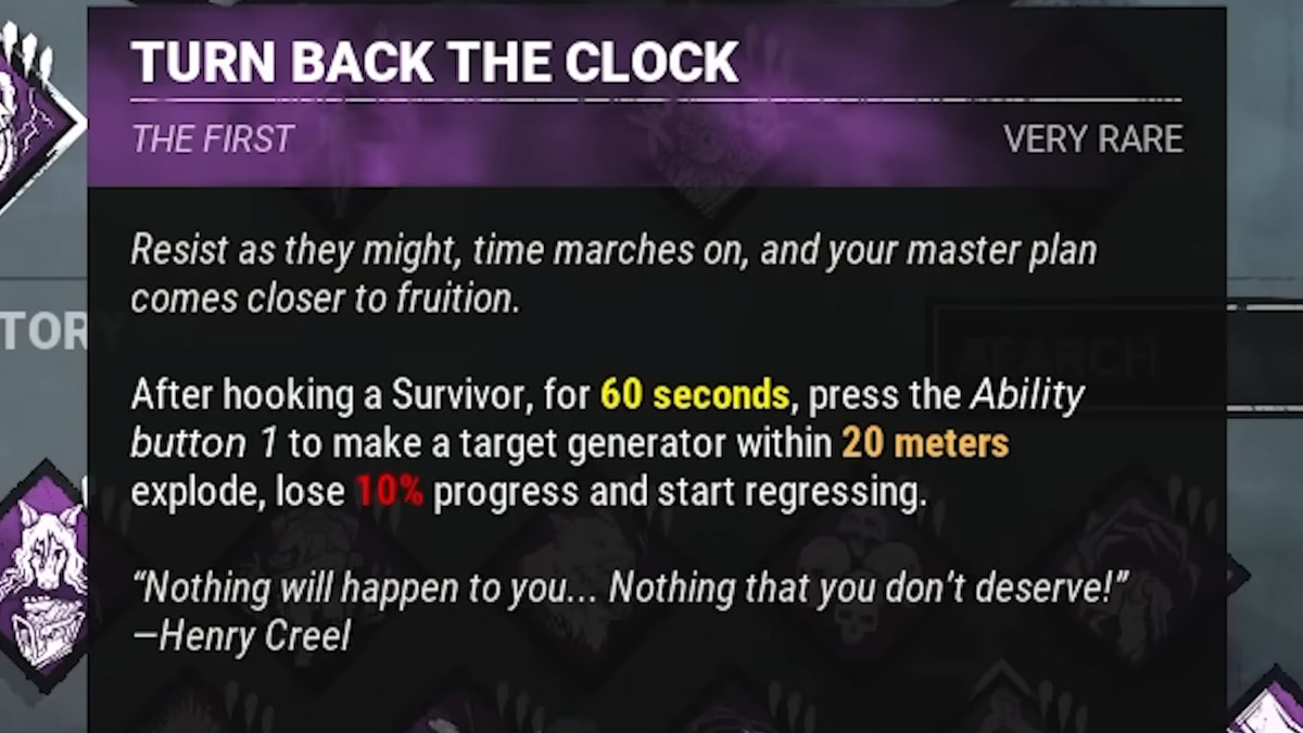 Замедлите Выживших, ударив по генератору своей способностью «Обратный ход времени». Это приведет к потере 10% прогресса ремонта одного из их генераторов, давая вам дополнительное время, чтобы найти и уничтожить их.