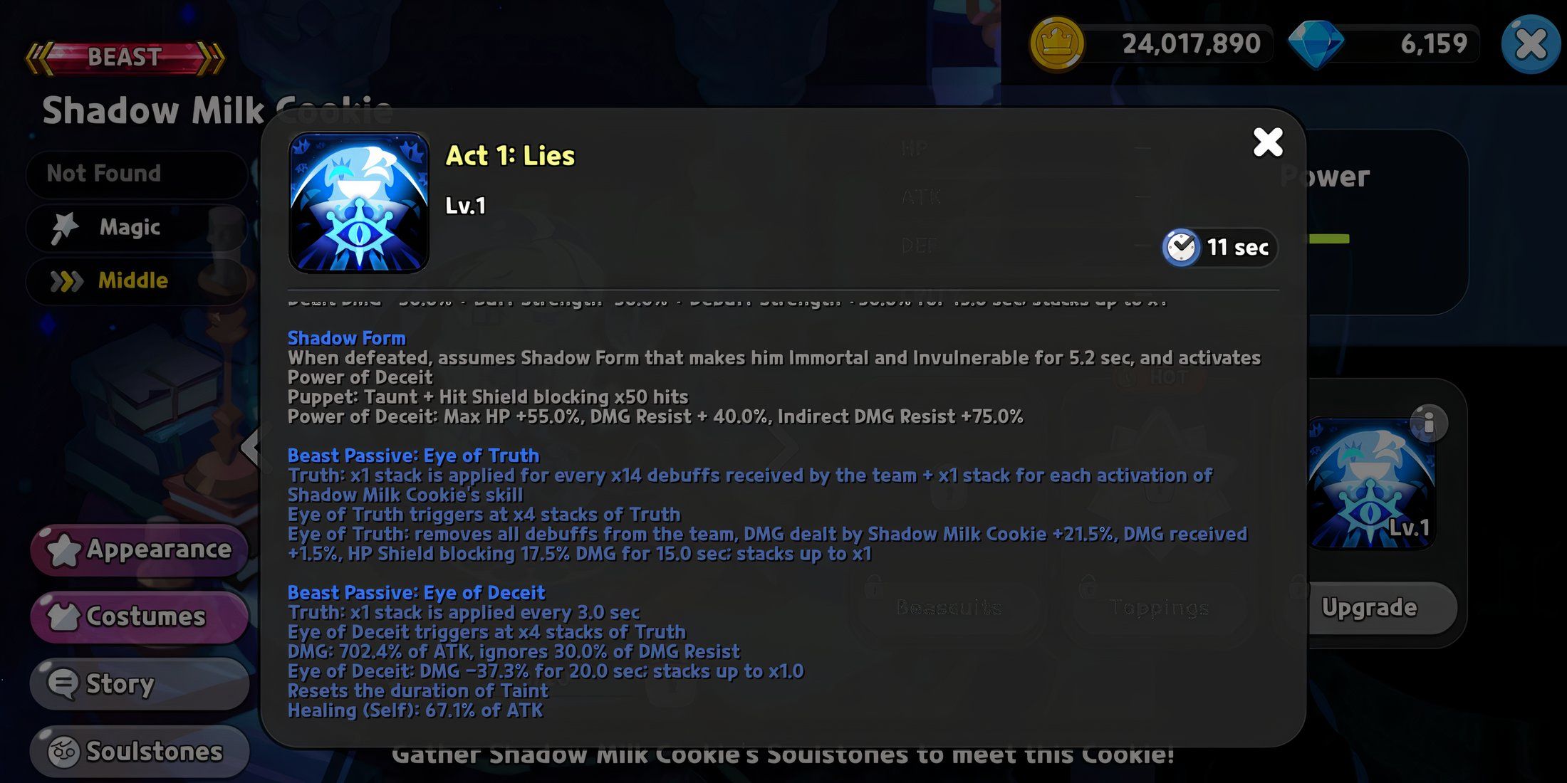 В игре ‘Cookie Run: Kingdom’ представлены различные типы печенек, некоторые из которых значительно сильнее других. К категории сильнейших (и самых редких) относятся Бестиальные Печеньки. Они были одними из первых персонажей, созданных в повествовании игры, но к сожалению со временем стали злыми. Одной из пяти таких Бестиальных Печенек является Теневая Молочная Печенька.