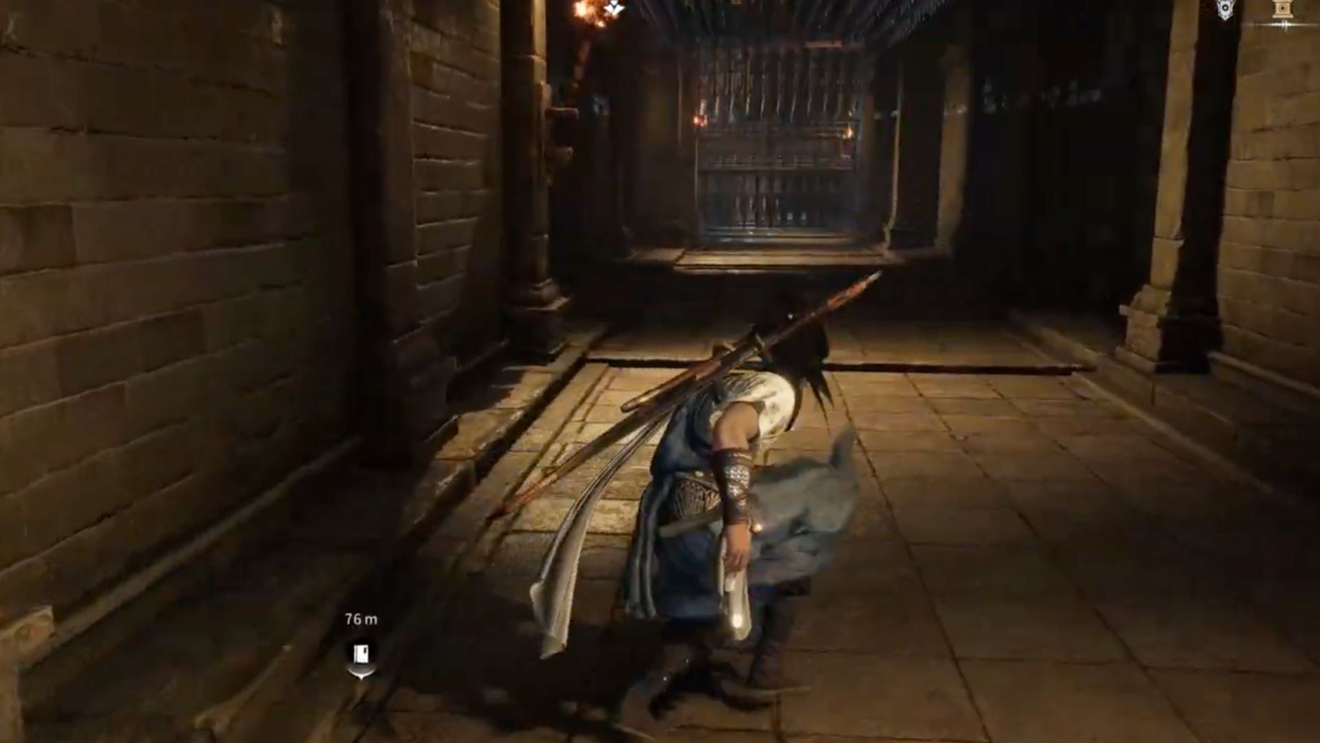 Продолжайте двигаться вперёд, пока не столкнётесь с ещё одной колокольчиковой головоломкой. Как и раньше, позвоните в колокольчик и немедленно используйте Meridian Touch на дверном молотке, чтобы открыть путь. Продолжайте идти, и вы найдёте камеру, охраняемую единственным врагом. Победите охранника и подберите копье.