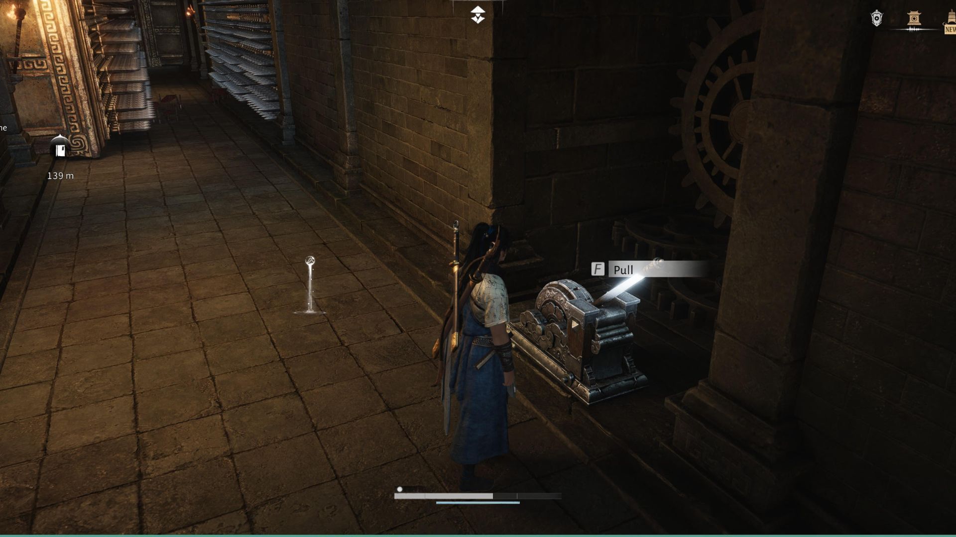 Продолжайте двигаться вперёд, осторожно избегая шиповых ловушек по обеим сторонам. Понаблюдайте, как они двигаются, затем быстро пробегите мимо них. Продолжайте движение по коридору, пока не увидите ещё один рычаг. Достигнув его, вы столкнётесь с ещё одной головоломкой с колокольчиком и молоточком.