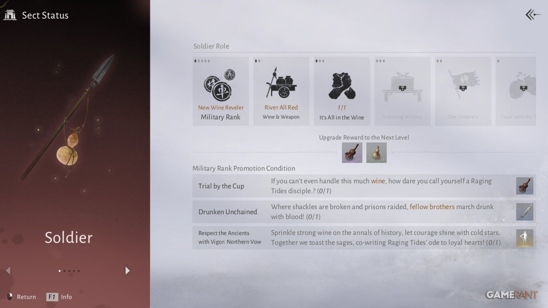 Чтобы получить престиж внутри секты Яростных Приливов, вам нужно поддерживать или наращивать эффект Опьянения, употребляя выпивку. По мере повышения в ранге вы получите новую должность в секте, включающую специальные преимущества и бонус Статуса Секты. Вы должны быть как минимум 22 уровня, чтобы повысить свой ранг.