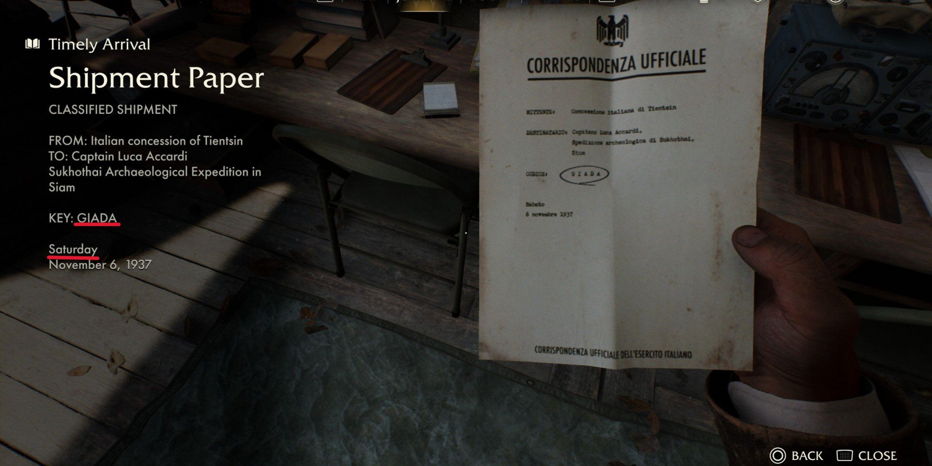 Разгадать тайну этого секретного груза становится легко, когда игроки находят две подсказки, связанные с загадкой «Своевременное прибытие». Эти важные подсказки можно найти на столе рядом с сейфом, и первой информацией, на которой им следует сосредоточиться, является документ об отправке, который содержит все необходимые детали для решения головоломки.